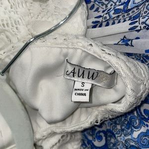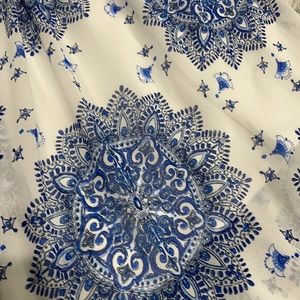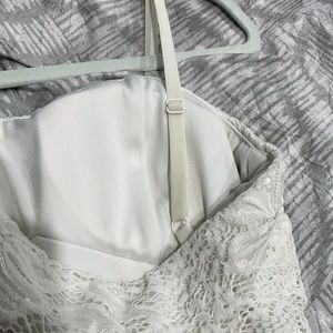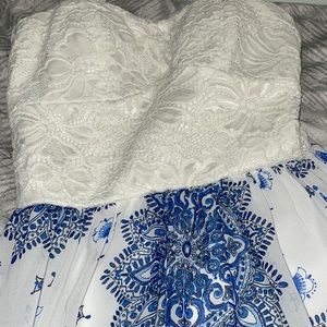 Beautiful summer dress. Lace top with shear blue flower pattern on bottom. Has short slip underneath. Bra padding and adjustable straps. Worn maybe 1 time.