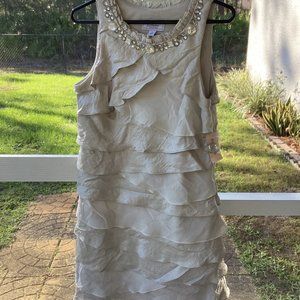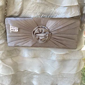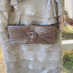 Beige dress to the knee with matching clutch / purse. Purchased but never worn. Great as a summer dinner dress