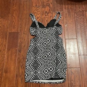 This is a beautiful black and white dress with a beautiful pattern it has slits on the sides and a zipper in the back the size is large