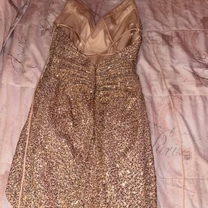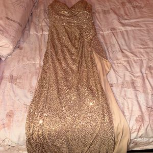 long gold prom dress with slit on right side sequenced