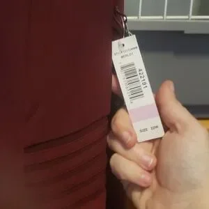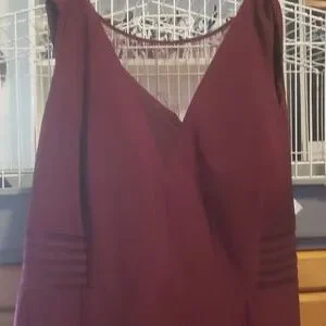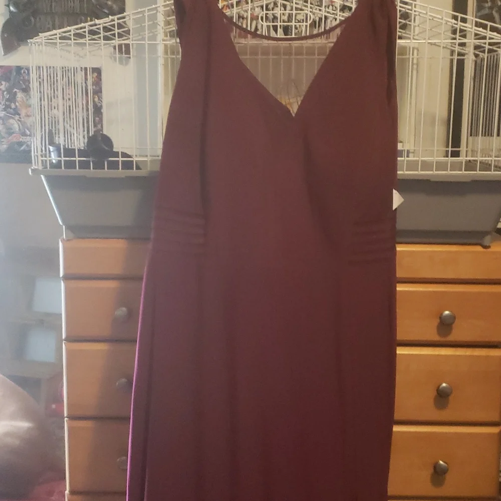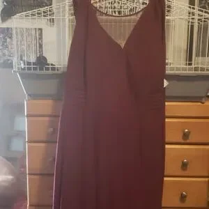 It's a burgundy dress brand new have never worn with the tags on it Very pretty for a simple evening gown or a prom or even a wedding or just a simple party to go to Original price was 300 asking a 100 willing to negotiate on price It has a sheer sea thru top it's sleeveless very casual but dressy at the same time