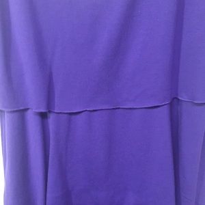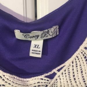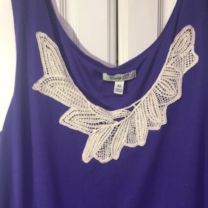 Purple jersey sleeveless layered dress. Crochet accent neckline.
