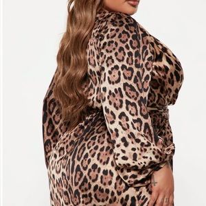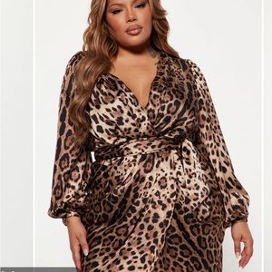 Leopard printed satin feel dress. Wrap design in front low cut and a belt that ties any way you want! Own the room in this dress get it before it’s gone!!! 👛👠👗