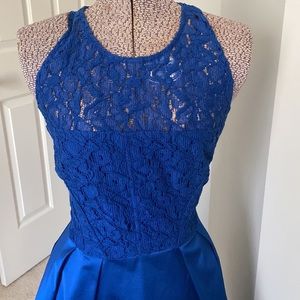 Gorgeous blue dress hits above knee. Sheer lace around shoulders and lined satin lower half. This isa truly elegant dress. Worn once to a wedding. No flaws.