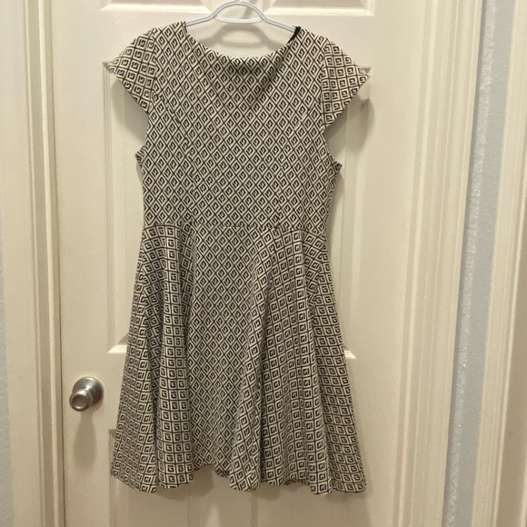 Sleeveless print dress. 61% polyester, 36% cotton, and 3% spandex. Lining: 100% Rayon
