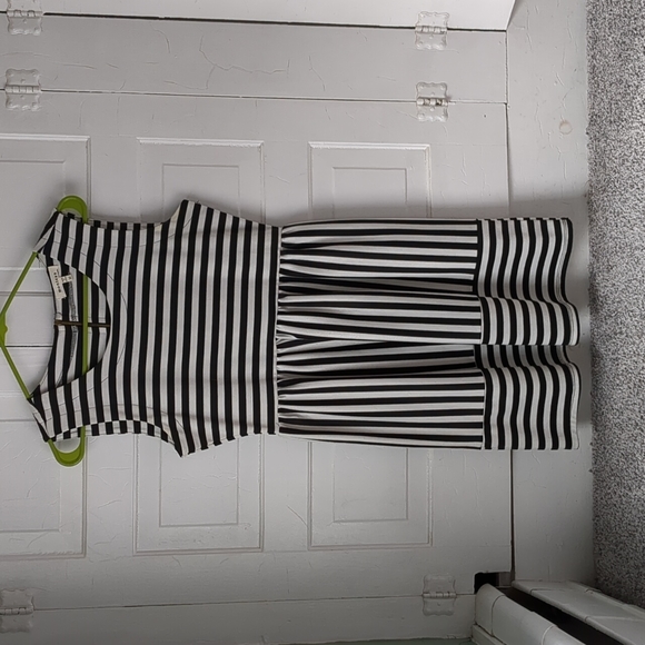 Black and white striped dress with fitted bodice and flowing skirt.