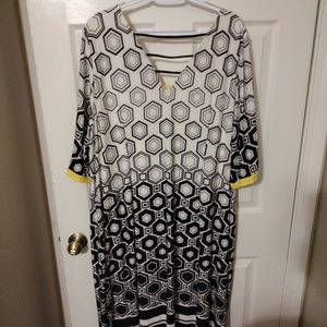 Dress is black white and yellow. short sleeves w/ openings on sleeve