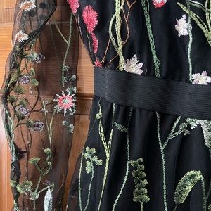 Floral designed dress with sheer material sleeves. Fits like a size M