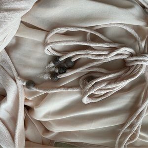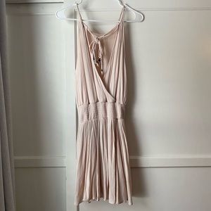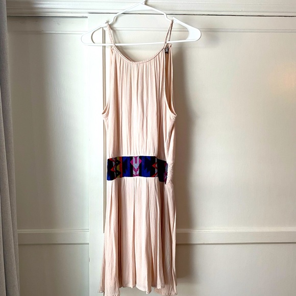 Cream colored flowy mini dress with colorful pattern detail at the cinched waist. Straps are braided and fit is adjustable with tie in the back which has decorative brown beads at the ends. Back is open criss cross fabric. Very comfortable and flattering, can be dressed up or dressed down for a more casual look. Used a handful of times.