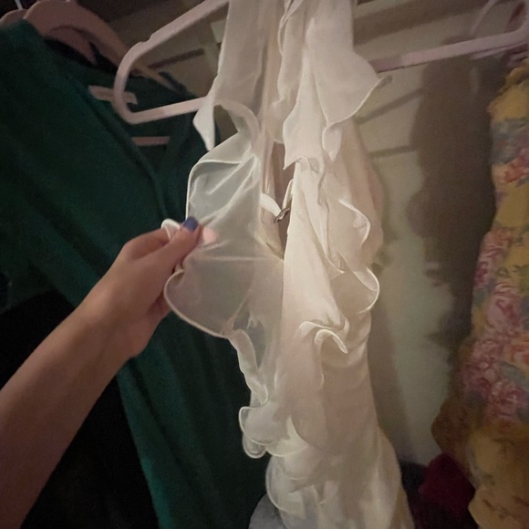 Elegant white dress. Open back with ruffles. Mini dress