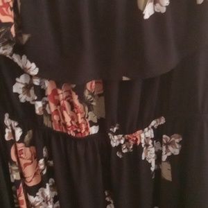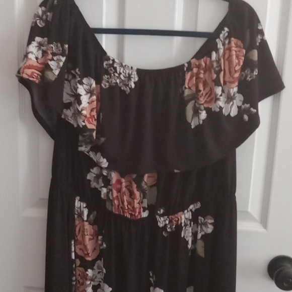lovely black floral hi low can be worn off shoulder. poly knit with elastic at the waist which can be pulled up and elastic at neck line to accommodate off the shoulder. very generous fit. no rips stains or marks