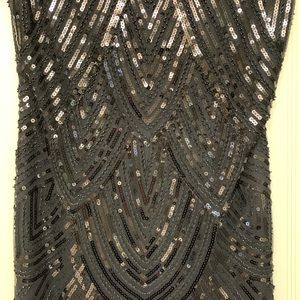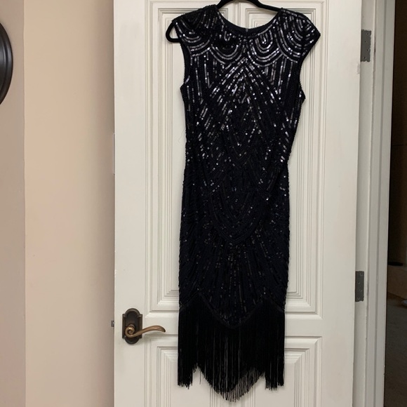 Long sequined flapper black dress with fringe bottom. Zipper back.