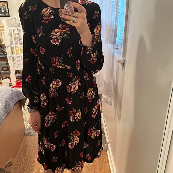 Beautiful dress that can be worn for many different occasions. Perfect condition. Size 10. Back button closure. Smocked waist. The length is right at the knees for me and I’m 5’11”.