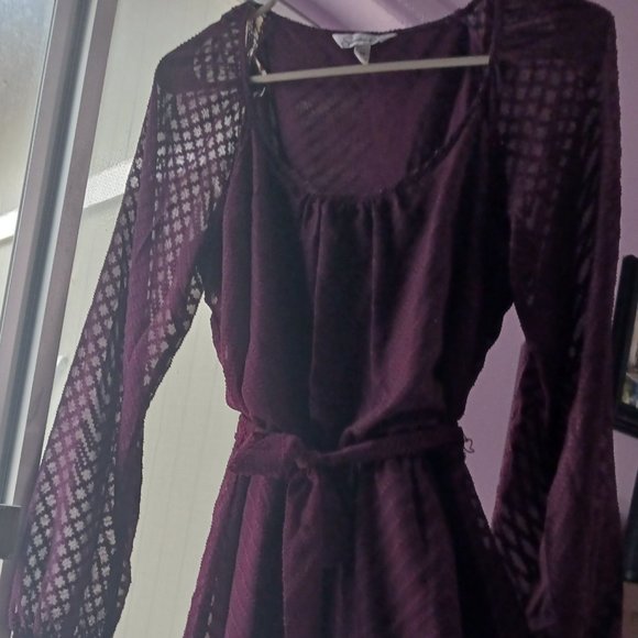 I have this beautiful purple flow like dress. See-threw sleeves. It also, has an arrow type design all over it.