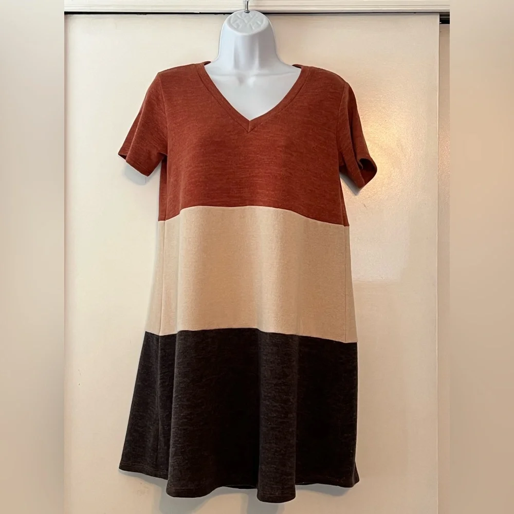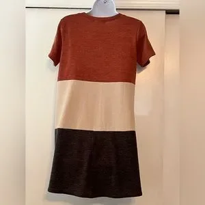 Color block “swing” dress. Rust, cream and charcoal colors. Above the knee but not mini.