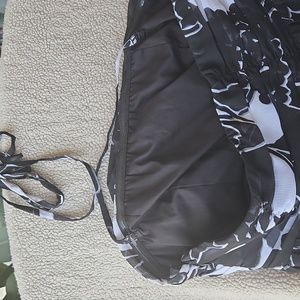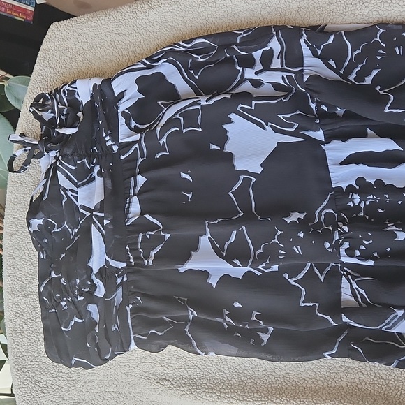 Long black & white floral, poly/rayon blend dress with removal halter ties at breast, can be worn as a tube. The top part is fitted with a side zip; it flows outward in an a-line shape with 3 rows of ruffles in the skirt. This dress is perfect t for weddings, day parties, or brunch with the girls.