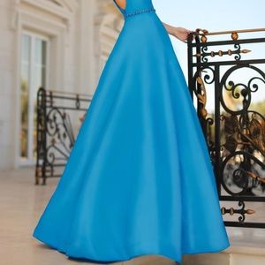 Classic taffeta ball gown with v cut neckline and v back. A line skirt with beaded belt. Color is ocean blue.