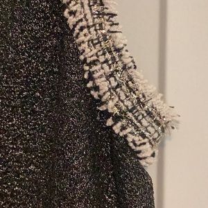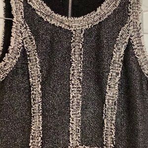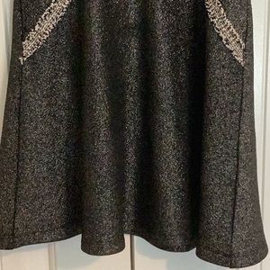 Black sparkly, sleeveless dress. Flared skirt. Zipper back with decorative zipper. Detailing on the front and around arm holes for a more fitted look. 100% polyester. Hand wash, flat dry. Brand unknown. Size M, but tag removed.