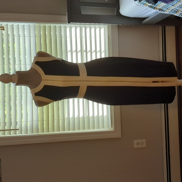Tommy Hilfiger size 4 black and white trimmed dress. Worn once. Fitted. Hits me right below my knee and I am 5 ft 4 inches tall. Comes from a pet and smoke free home.