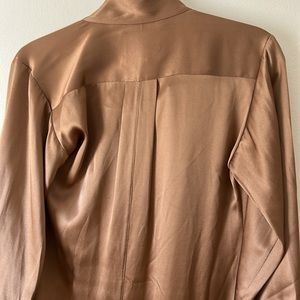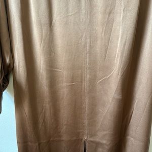 Crafted from luxurious 100 percent silk .This kaftan Maxi has resort elegance .Long drapey sleeves end in softly tailored cuffs and a front slit.