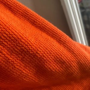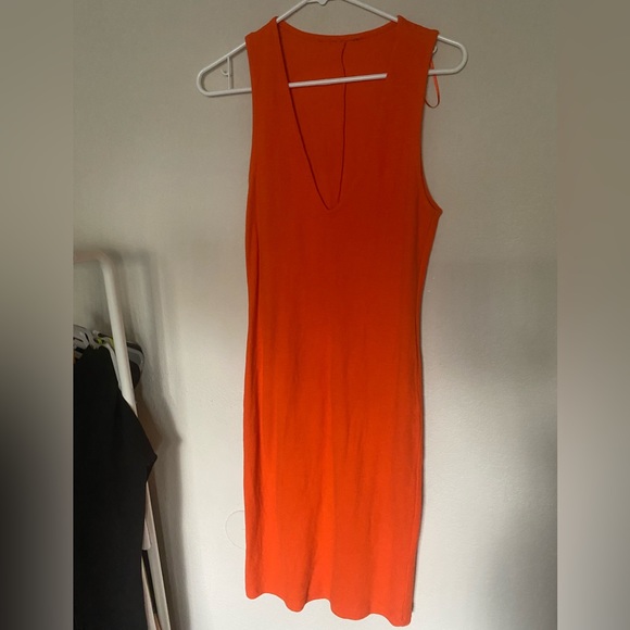 Orange V neck dress does not come with brand or size but fits a medium or lighter large. It is a very stretchy material so there is room to fit in if needed:) comfy material, stretchy and in great condition:)