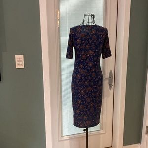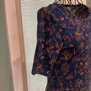 Length 36”, 3/4 sleeves 10”, chest 31”, scooped neck, unlined, polyester spandex, excellent condition,