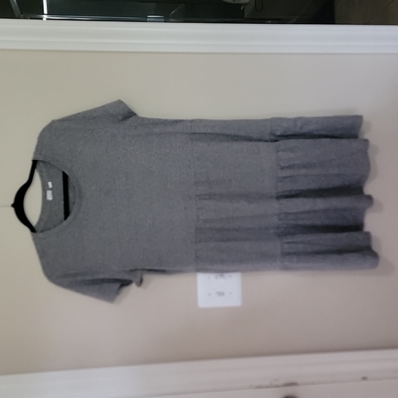 Heather gray t-shirt dress with ruffled tiers.