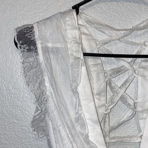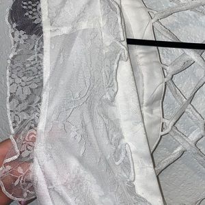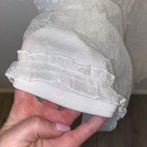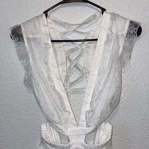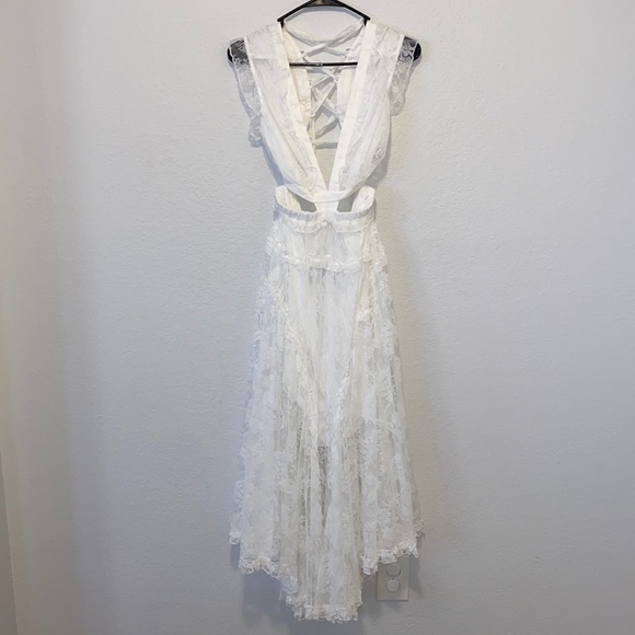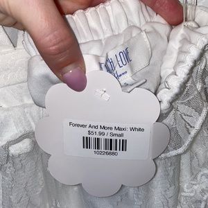 “Forever And More Maxi Dress” from Hope’s. Beautiful white lace maxi dress featuring ruffle detailing along the hem, sleeves and throughout. Front features a deep v neckline & the back features adjustable lace up detailing. Elastic waistline & lined to mid thigh.