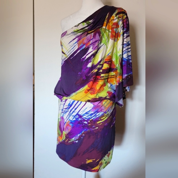 One shoulder Party Dress. Size S. New never worn. Soo cute.. mid thigh to upper thigh length. Double lined and elastic at waist. Purple with floral designs.