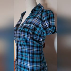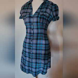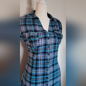 Flannel Plaid Dress.. front button down. chest pockets.. with collar. super cute and great color. Size M ... when few times with tights and boots. 100% cotton..