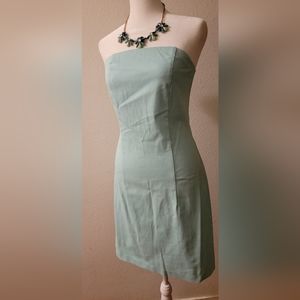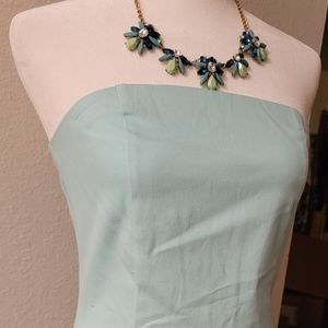 Green/blue dress... solid strapless.. beautiful. Zip back size M .. Is stretchy material with spandex and cotton.. cute for a bridal shower or an Easter brunch.. or just vacation. almost a seafood color