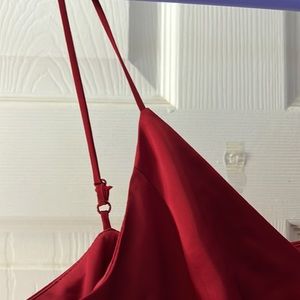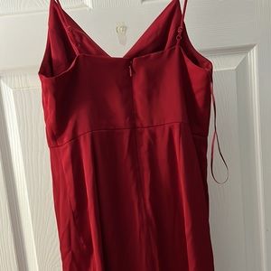 Very pretty deep red dress. Adjustable spaghetti straps. Zipper back. Nice drape slit on in front. High low style ham. V-neck. Measures 44 inches from the neck to hem. Measures 12 1/2 inches at waist. Light weight and comfortable. Worn only one time received many compliments dress will be steam pressed for delivery.🙂