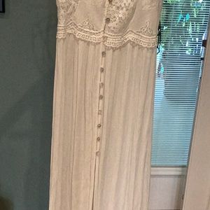 Length 53”, chest 30”, mother of pearl buttons Down front, unlined skirt, lined bodice, excellent condition, sleeveless, armpits 9”, rayon, polyester,