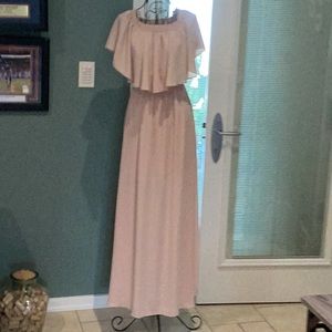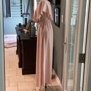 Length 53”, chest 30”, elastic waist unstretched 23”, large ruffle covers bodice, smocked neckline, short skirt lining, polyester,
