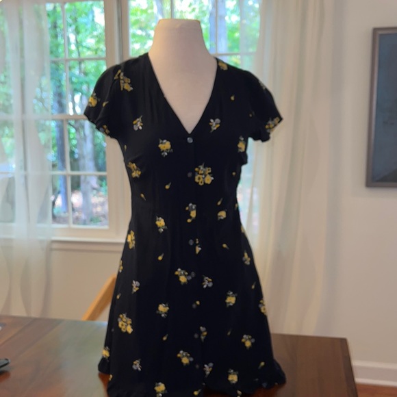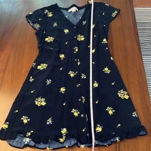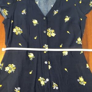 Navy dress with flowers on it, IP, buttons down front , measurements are in pictures, in very good condition