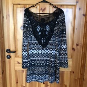 Dress sits above the knee, has lace back and bell sleeves. Has a bit of spandex so stretchy and comfortable