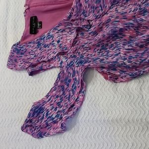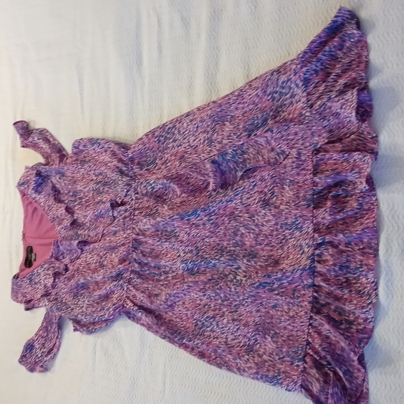 dresses made of 100% polyester lining forro the dress has a cap sleeves ruffles around the neck in the sleeves and down the front of the dress and around the bottom of the dress it has a elastic in the middle zipper down the back has a scoop neck