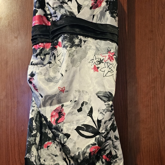 Floral black,pink, and gray mini polyester dress with a liner. Dress can be worn with or without the straps.