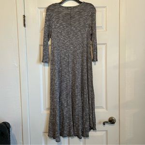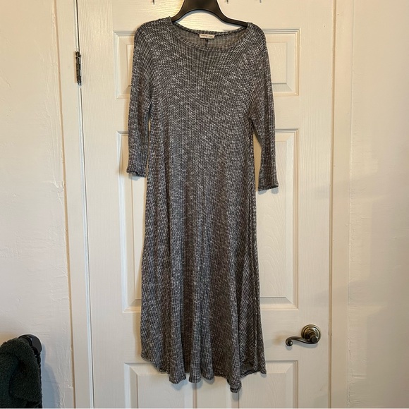 Super cute dress. Has a thin faux tweed look. Lighter fitting in the sleeves and goes out flowing after your bust. Size M.