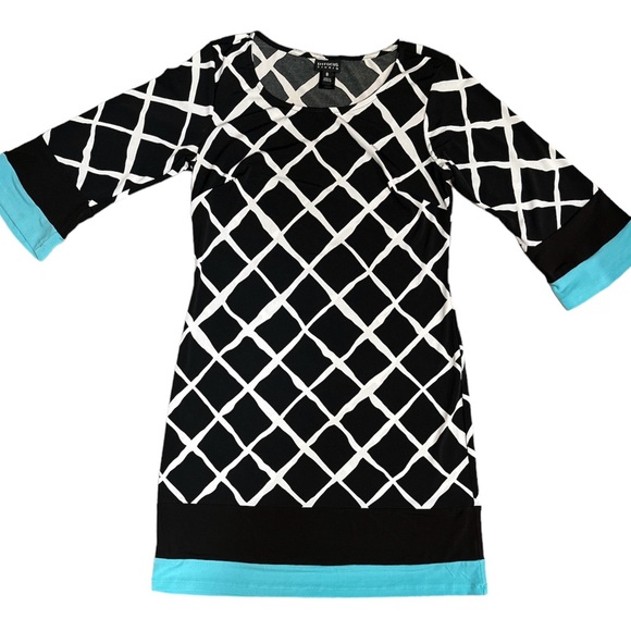 Fun dress. Black with turquoise blue trim. Approximately 34 1/2" from shoulder to hem.