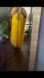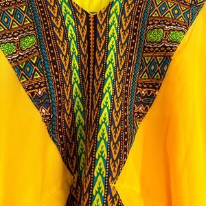 Yellow long pull over polyester dress with short sleeves and a colorful embroidery designed V-neck.