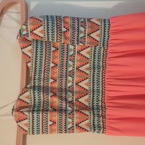 maxi strapless dress. under skirt comes to your knees the over skirt is sheer to the ground it is a coral and teal colors size medium there is a tear on inside of top but it does not affect the dress