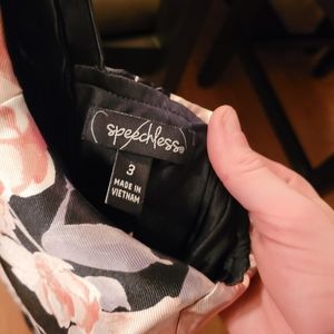 Mid length pink and black floral dress. Label on tag says "Speechless" and that its a size 3. Cute dress for a homecoming.