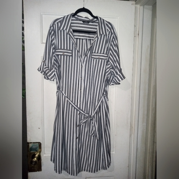 black and white striped dress with collar and a belt button up fabric very soft great to wear to work