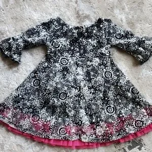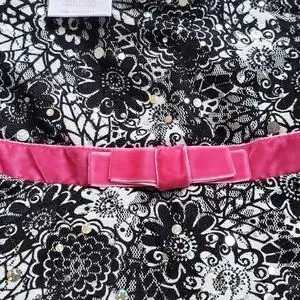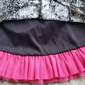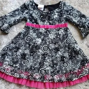 Super cute Nanette size 2 toddler dress with matching underwear. Tiny sparkling disc's an attached black underlay with pink ruffle, and a pink velvet sewn on belt give it extra flair. New without tags, underwear still attached with plastic tags. Smokefree home.