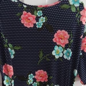 Nina Leonard matte jersey dress. elbow length sleeve with flair skirt with navy godet panels. dress has scoop neck with self tie belt. bust measurement approx. 22 inches from shoulder to hem approx. 46 inches. navy dress with small white dots and lovely floral design with salmon color flowers mixed with blend and green.