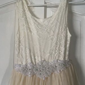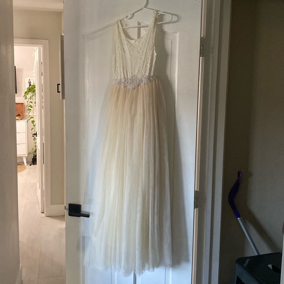 Used ones for a flower girl. Great condition. Off white color lace with rhinestone trim fits size 8/10