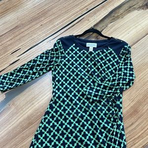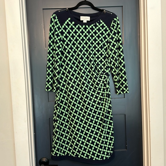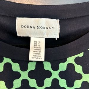 Donna Morgan dress in geometric print. Dress includes a slip for smoothing look. Machine wash in gentle cycle. Material is polyester and Lycra.