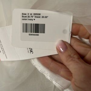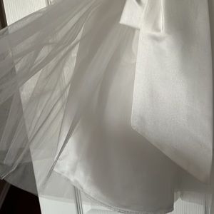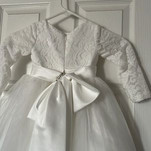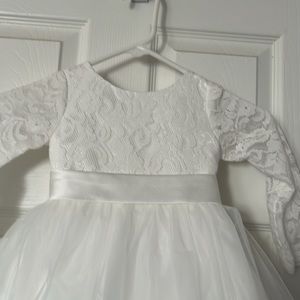 Absolutely gorgeous little bridesmaids dress dress. Never worn. Beautiful satin ribbon around waist with bowtie in the back. Bottom has layers of tool and material for a full look. Top is all lace. Scoop neck absolutely beautiful dress.😊