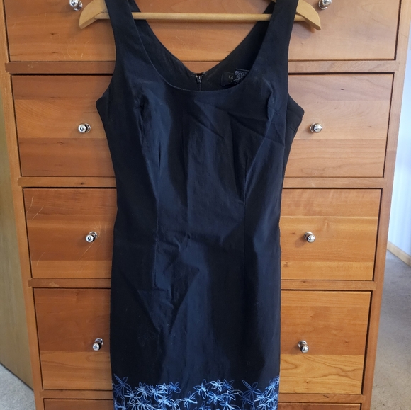 Black dress with blue stitched flowers at bottom from Express. Size 1/2. Stretch.